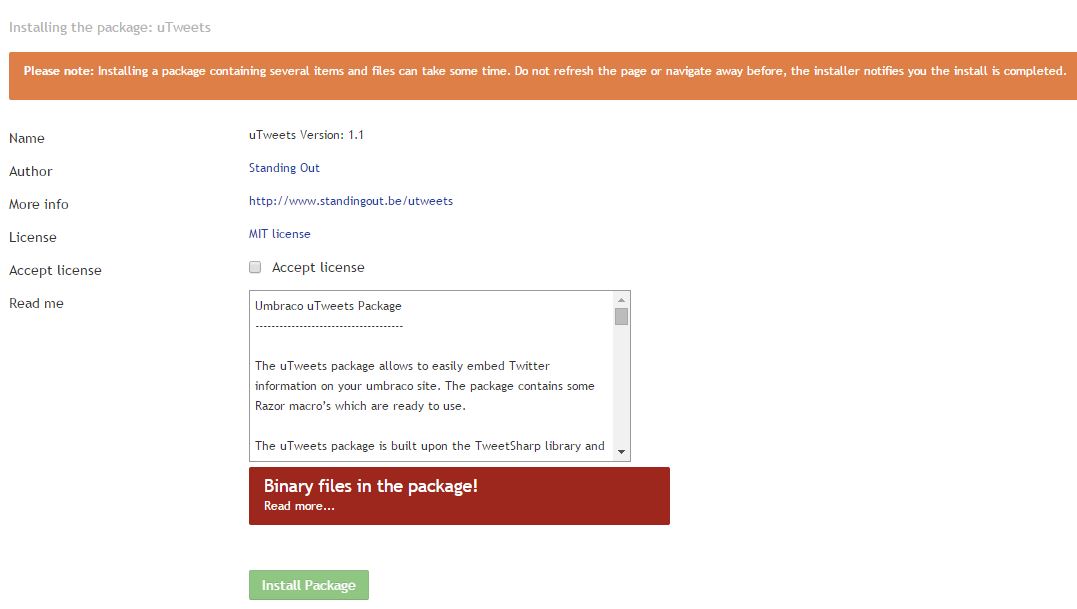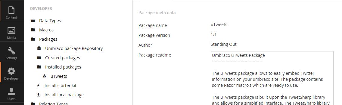 We were recently asked how to install a package in Umbraco 7. So here is a quick quide on how to. We are using the excellent uTweet package for reference.