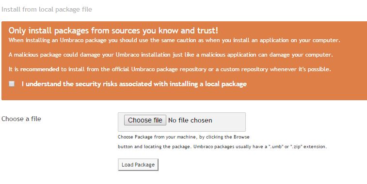 2. Check the tickbox (make sure your package comes from a reliable source like http://our.umbraco.org/projects/popular) and then select your package zip file and then click 'Load Package'.