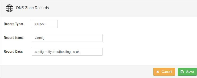 7. Select CNAME from the Record Type dropdown. Insert your details for the CNAME record then click the 'Save' button. Note: You do not put your full domain name in the Record Name