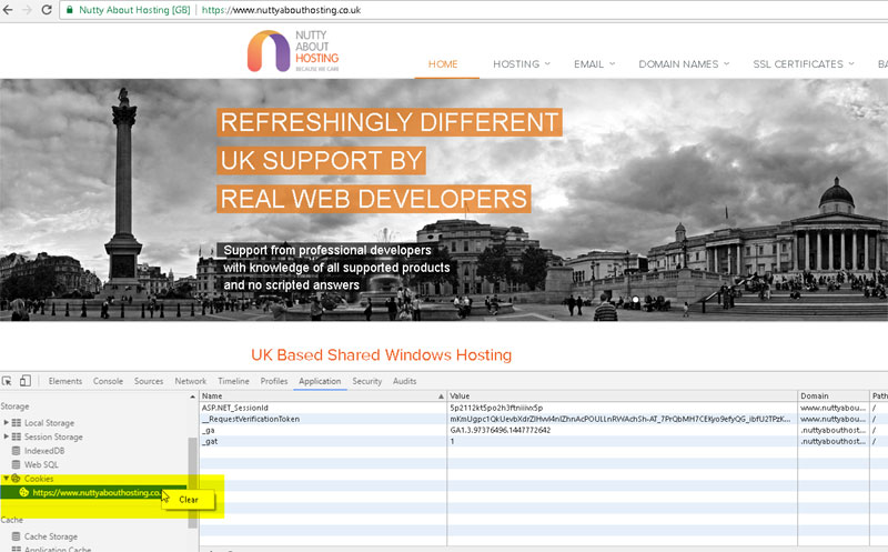 Click on the 'Application' tab and expand the 'Cookies' menu option. You should see https://www.nuttyabouthosting.co.uk there. Right click on the link and then click 'Clear'