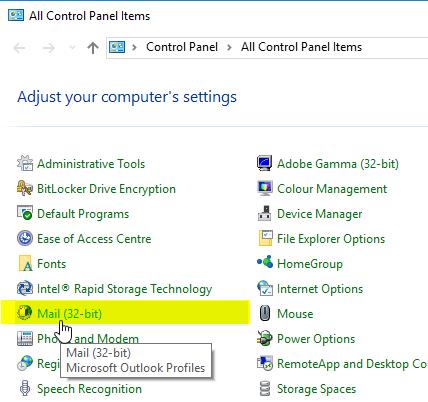 1. Go to your 'Control Panel' and start the Mail application "Mail (32 bit)" - it might also be name like "Mail (Microsoft Outlook 2016) (32 Bit)".