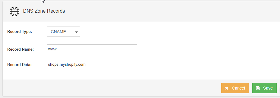 9. Select CNAME from the dropdown and enter www in the "Record Name" box and shops.myshopify.com in the "Record Data" box and then click "Save"